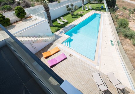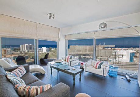 The master bedroom has an en suite bathroom with shower and WC, double bed and a balcony. There is another double bedroom and a twin bedroom (kids room). From the double bedrooms you can enjoy the stunning Protaras sea views.